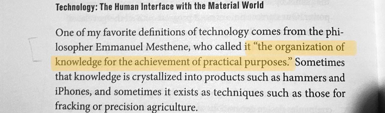 Определение технологии от Emmanuel Mesthene из книги "More from Less": "организация знания для достижения практических целей". Знакомые какие обертоны.