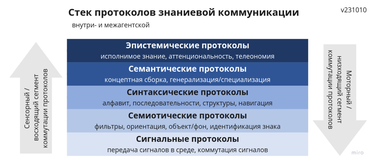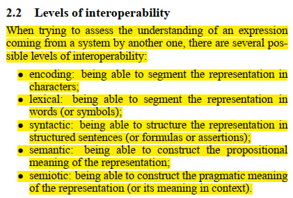 Нашёл у J. Euzenat в "Towards a principled approach to semantic interoperability" структуру "уровней интероперабельности", подобную знаниевому стеку, только собранную лет на 20 раньше (2001) и без эпистемологического фреймворка на бекенде. В модели коммуникации/интероперабельности Озена (это француз) отсутствует сигнальный уровень, за то синтаксис разорван пополам на lexical и собственно syntactical - по-моему, смысла в этом мало.